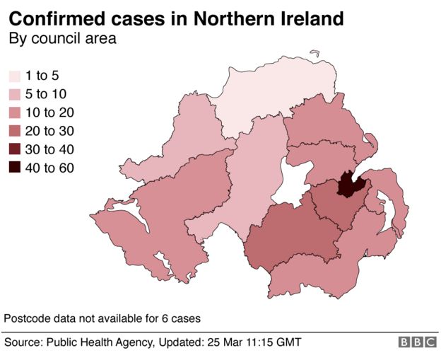 Mapa Irlandii Północnej z potwierdzonymi zakażeniami COVID-19